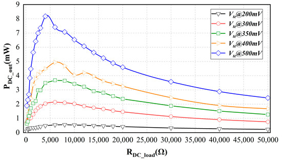 The laboratory experiment of the thermoelectric conversion device focused on testing the performance of the power management system under different temperature differences. In this study, the relationship between the key index of the power management circuit (i.e., the output power PDC_OUT of the DC–DC converter) and the input voltage Vte was tested first. As shown in Figure 8, with a stable input voltage Vte, the output power PDC_OUT increased rapidly first as the load resistance RDC_load reached a maximum value and then decreased slowly. This is due to the gradual equalization of the converter internal resistance Rin and load resistance RDC_load, which makes the system catch up to the maximum power point. The maximum output power point varies at different input voltages Vte, and varies roughly between 4 KΩ and 8 KΩ. The designed DC–DC converter achieved a maximum output power of 0.55 mW at the lowest input voltage Vte = 200 mV and load resistance RDC_load = 8 KΩ, compared to 8.17 mW at the input voltage Vte = 500 mV.