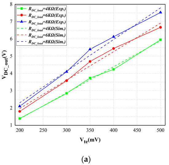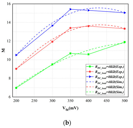 As shown in Figure 9, the maximum power point of the DC–DC converter was measured to vary in the range of 4 KΩ to 8 KΩ, while the relationship between different input voltages Vte and converter output voltage VDC_out was measured and the trend of the boost ratio M with the growth of the input voltage Vte was calculated by Equation (16). The input voltage and output voltage were linear at different load resistances, and the measured value was almost always the same as the simulated value, with a maximum error of 6.94%. This type of error is mainly because the threshold voltage of different transistors in the circuit will change with the use of time, leading to a change in the on-state current. The relationship between the voltage gain M under different load resistance RDC_load is shown in Figure 9. When the input resistance was lower than 350 mV, the relationship was linear, but with the increase in input voltage Vte and load resistance RDC_load, the voltage gain began to decline, and it can be seen that the voltage gain as an indicator to design the power management system is not a case where the larger the input, the better. Therefore, it is necessary to have a compromise input voltage, load resistance, and efficiency.