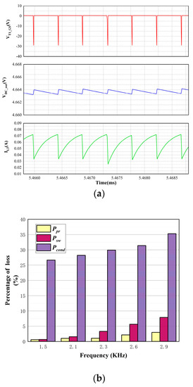 The most distinctive feature of the PMS mentioned in this design is that during the ultra-low voltage start-up process, there is no need to use an external energy supply to control the switching closure of the DC–DC converter’s switching transistors, but the negative pulse oscillation generated by the start-up circuit is used to achieve this. When transistor J1 is turned off, at this moment, inductor L3 is in the state of charging, and energy is transferred from input capacitor C1 to the inductor. When switching transistor J1 is turned on, the inductor energy is transferred to output capacitor Cout through J2 because the direction of the inductor current cannot change abruptly. In this process, the converter output voltage VDC_out rises gradually and finally becomes stable. As shown in Figure 10a, it can be seen that the duty cycle of the control waveform of the switching transistor gate J1 is large, which can guarantee that the output voltage is much higher than the input voltage. However, different duty cycles imply different energy losses. The circuit designed in this study is an energy conversion circuit, and there are various losses in the conversion process. The switching loss and conduction loss are caused by the gate parasitic capacitance of the switching transistor and the current flow through the non-ideal components, respectively. Equation (18) can be expressed as Pcond = (Wt1 + Wt2)·fw, where Wt1, Wt2 are the inductor current IL3 working in different two stages of the turn-on (off) loss, so from Equation (17) and Pcond = (Wt1 + Wt2)·fw, it can be seen that the loss of the system is related to fW, and the percentage of each average loss at different frequencies is shown in Figure 10b. The loss of the system increases with frequency, and when the frequency approximates 3 KHz, the maximum conduction loss can account for 35.27% of the overall power. The essential reason for the JFET transistor switching loss is that the voltage and current overlap zone exists because the JFET turn-on and turn-off are not instantaneous, as discussed in Section 2.2. Therefore, using soft switching technology or selecting relatively small RDS(on) switching transistors can effectively reduce the system losses and thus improve the overall efficiency.