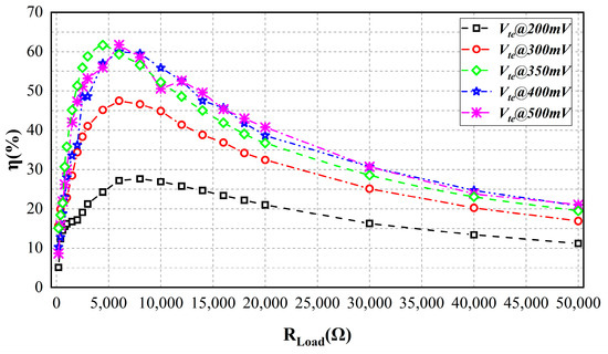 The circuit in the laboratory was tested by connecting four TEG (Rte ≈ 20 Ω) in series. The corresponding input power Pte and output power PDC_out were obtained by varying the load resistance RDC_load when the input voltage was fixed, resulting in η = PDC_out/Pte. As shown in Figure 11, the overall efficiency of the power management system first increased with the increase in the input voltage, which was most obvious when the Vte increased from 200 mV to 300 mV. However, with the increase in Vte, the efficiency of the power management system no longer increased obviously and then finally decreased slowly with the increase in load resistance. The output efficiency of this design was 27.628% at the lowest input voltage of 200 mV, and the highest efficiency could reach 65.38% at the input of 500 mV.