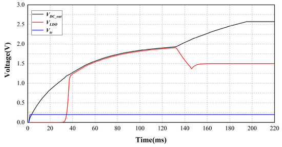 The working process of the power management system is shown in Figure 12. When the external input voltage was 200 mV, the startup circuit started to work and began to provide oscillation pulses for the DC–DC converter, and the switching transistor T2 of the DC–DC converter allowed the inductor L3 and the capacitor Cout to keep converting energy through the non-stop switching closure. In the meantime, the converter output voltage VDC_out was continuously increased. At about 36 ms, the LDO circuit connected to Cout started to work and VLDO_out was raised with the increase of VDC_out. At around 133 ms, the LDO circuit entered the regulator state, and VLDO_out gradually dropped to 1.5 V and finally stabilized. Since the LT1763 series chips provide internal protection circuits including reverse battery protection, current limit, thermal limit, and reverse current protection. These devices can provide fixed output voltages from 1.5 V to 5 V, and the final regulated voltage depends on the needs of the application (details are omitted here for the sake of brevity).