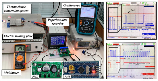 As shown in Figure 13, a power supply system for forest fire monitoring was constructed in the lab, and since the heat source was a digitally controllable electric heating plate, the temperature of the hot end could be adjusted in accordance with the needs of the experiment. The output of the thermoelectric conversion module was connected to the input of the PMS, and the temperature of the hot and cold sides of the TEGs and the output voltage were measured using the same T-type thermocouple as the outdoor thermoelectric conversion device, and the working status of the sensors was monitored using an oscilloscope. The whole experimental process can be described as follows. When the temperature of the digital electric heating plate rises, the two sides of the TEG begin to form a thermal gradient. The simple temperature conversion device begins to generate power, and when the output voltage is higher than 200 mV, the start-up circuit of the PMS control of the DC–DC converter switch transistor starts working. When the PMS output voltage rises to 3.3 V, the fire monitoring system enters the work standby status. The FMS is capable of detecting the smoke concentration in the environment and has an alarm function as an instrument. The most basic components of this alarm system should include a signal acquisition analog-to-digital conversion circuit, microcontroller control circuit, character display circuit, sound and light alarm circuit, and safety protection circuit, and other components, with a display alarm status (blue LED and buzzer). A smoke detection alarm with an STM32 microcontroller as the control core, the choice of MQ-2 semiconductor gas smoke sensor to collect smoke concentration information, and peripheral circuitry formed a smoke alarm system. As shown in Figure 13, when the flame detection system detects smoke, the MCU makes one of the I/O ports an output to drive the buzzer (the other one lights the blue LED), and through simple programming to make the I/O port output high level for 250 ms and low level for 250 ms, it can realize the cycle of 500 ms and control the buzzer to alarm at a frequency of 2 Hz, which provides a foundation where the energy harvesting and PMS can replace power supply modules such as batteries and extend the service life of micro-power loads such as fire monitoring sensors.