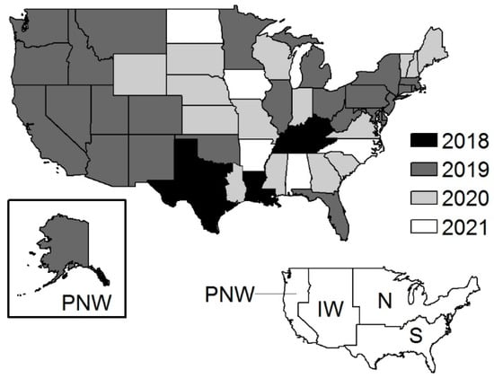 Tree-, condition-, and subplot-level data for the most recent available inventory year of all states except Hawaii were included in the analysis (Figure 1). Data were collected with protocols outlined in FIA field guide versions 7–9 []. Only plots of the baseline sampling frame were included. The number of tree and seedling count observations available for analysis varied by region and ranged from <1000 to >235,000 (Table 1). All data are available to the public through the FIA online database [] and were downloaded during the first week of July and the second week of August 2022.