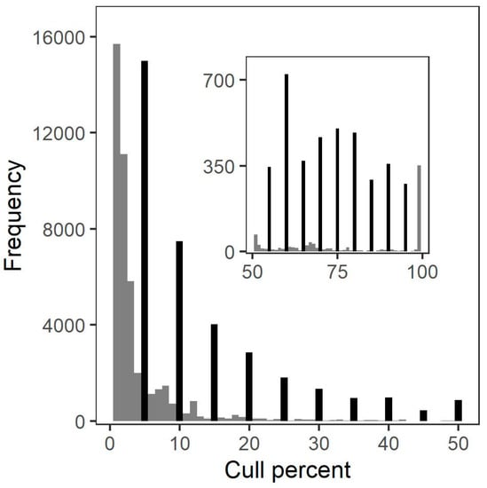 Distribution of rotten/missing cull volume > 0%. Darkest bars indicate values ending with the digit zero or five.