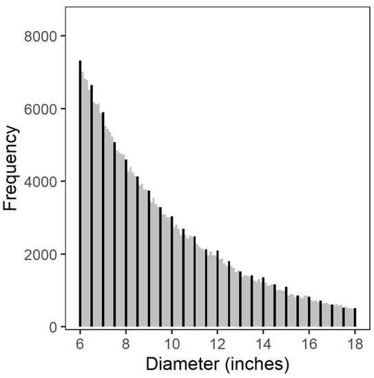 Common sources of measurement error in a forest inventory include uncalibrated or faulty equipment, negligent record keeping, and lax or improper field techniques. A less cited source of measurement error occurs when data are coarsened by rounding or other approximation. Number preference (NP), i.e., the human tendency to gravitate toward or away from specific numbers [], is a type of data coarsening. NP occurs in a variety of circumstances, ranging from baseball players modifying their at-bat strategy to end the season with a batting average over 0.300 [] to diners leaving gratuities in whole-dollar amounts or in amounts that make the total bill a whole-dollar amount []. Other examples of NP have been observed in marathon run times [], economic and financial environments [,], human dimension surveys and behavioral studies [,,,], and wildlife sampling []. The phenomenon occurs not only when individuals self-report metrics such as income [] but also when instrumentation is used for direct measurements, e.g., blood pressures [], carcinoma sizes [], and fish lengths [].