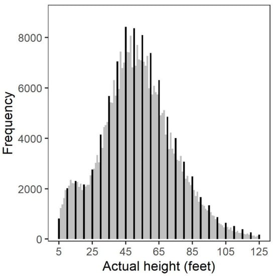 Actual height distribution for an exemplary subset of tree-sized stems. Darkest bars indicate values ending with the digit zero or five.