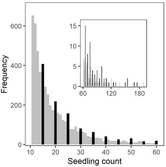 Distribution of seedling counts > 10. Darkest bars indicate counts ending with the digit zero or five.