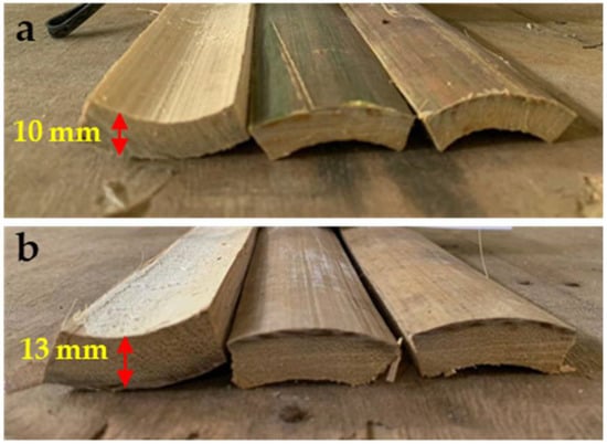 Gigantochloa levis, locally called Beting bamboo, and Gigantochloa scortechinii, locally called Semantan bamboo were used to make 3-layer laminated bamboo in this study. Three-year old bamboo culms were selected from a bamboo plantation near Nami, Kedah. G. scortechinii and G. levis have average densities of 700 kg/m3 and 751 kg/m3, respectively. The modulus of rupture and modulus of elasticity of the former are 125 N/mm2 and 10,039 N/mm2, while those of the latter are 163 N/mm2 and 13,185 N/mm2, respectively. G. levis is a large species of bamboo with an average culm size of 11–13 cm and a wall thickness of 11–15 mm, with estimated height and length of 18–23 m and 35 cm, respectively. The height of G. scortechinii is between 17 and 20 m. This bamboo’s internode is 42 cm long and has a culm length of 9–11 cm. The wall thickness ranges from 6 to 10 mm. The culms were transported to Saudagar Bamboo Enterprise located in Kuala Nerang, Kedah, for further processing. The culms were cut to 2 m long then ripped into splits of 22 mm wide (Figure 1). The bamboo splits were then flattened and shaped using thicknesser machine before being planed to a final thickness of 5 mm using a double-sided planer. The final dimensions of the bamboo strips was 2000 mm long × 20 mm wide × 5 mm thick. The bamboo strips were then soaked in 5% boric acid solution for 24 h and kiln dried to a 12 ± 2% moisture content. The densities of the bamboo strips after conditioning are 685.51 kg/m3 and 689.91 kg/m3 for G. scortechinii and G. levis, respectively.