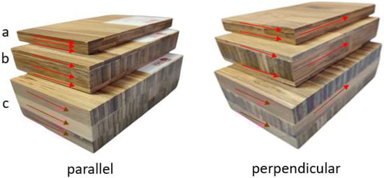 Parallel and perpendicular lay-up patterns of bamboo strips with different arrangements: (a) horizontal; (b) mixed; and (c) vertical.