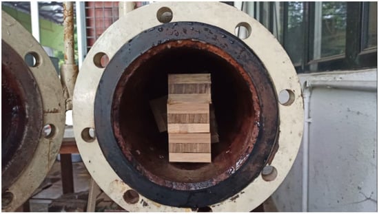 Three-layer laminated bamboo samples with dimensions of 75 mm wide × 130 mm long and various thicknesses were prepared for delamination evaluation. The delamination test was conducted according to the procedures specified in EN 391:2002—Glued laminated timber—Delamination test of glue lines. The test cycle for method B was chosen. The samples were placed in a pressure vessel as shown in Figure 5 and submerged in water at ambient temperature. A vacuum of 60 kPa was applied and held for 30 min. Subsequently, the vacuum was released and a pressure of 550 kPa was applied and retained for 2 h. Once the vacuuming was completed, the test pieces were dried for a period of approximately 10–15 h in a circulating oven at 65 ± 10 °C. Delamination was observed and recorded when the mass of the test pieces had returned to within 100% to 110% of the original mass. After removal from the oven, the samples were examined for the occurrence of delamination or open glue lines. The length of the open glue lines was determined by first inserting a thin metal probe between the two delaminated surfaces. Measurements count if the depth of the delamination is less than 2.5 mm and more than 5 mm. Two attributes were determined, (i) total delamination and (ii) maximum delamination of a test piece, according to Equations (2) and (3):