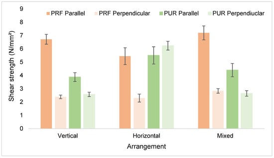 Twelve replications were tested for each species, adhesive and configuration. A total of 288 samples (2 × 2 × 6 × 12) were tested. The shear strengths of the glue lines obtained were then compared with EN14080:2013—Timber structures—Glued laminated timber and glued solid timber—Requirements for parallel arrangement and EN16351:2021—Timber structures—Cross laminated timber—Requirements for perpendicular arrangement. It is stipulated in the standard that the minimum requirements for parallelly arranged laminated boards shall be at least 4 N/mm2 (EN14080) and at least 2 N/mm2 for laminated boards arranged perpendicularly.