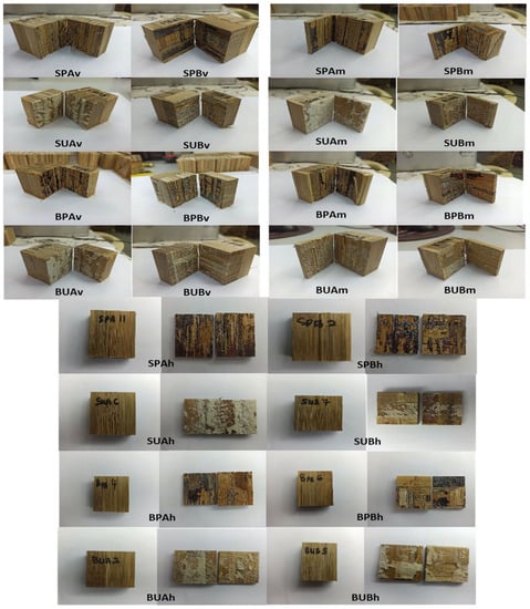 Sheared samples of laminated bamboo boards fabricated with different species, adhesives and configurations. Note: SPA—Semantan PRF parallel; SPB—Semantan PRF perpendicular/cross. SUA—Semantan PUR parallel; SUB—Semantan PUR perpendicular/cross; BPA—Beting PRF parallel; BPB—Beting PRF perpendicular/cross; BUA—Beting PUR parallel; BUB—Beting PUR perpendicular/cross; v—vertical arrangement; h—horizontal arrangement; m—mixed arrangement.