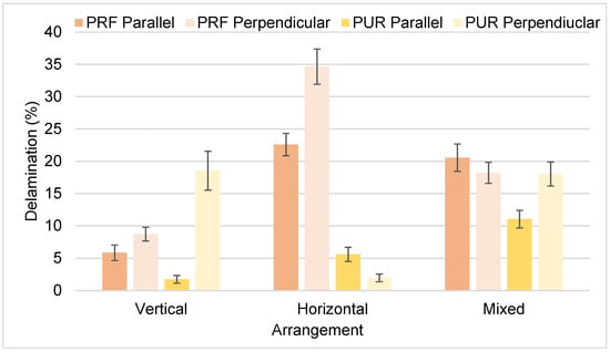Adhesive types had the most influence on the delamination of samples. PRF-bonded laminated bamboo has a lower delamination percentage as compared with PUR-bonded laminated bamboo in vertical arrangements. However, in the horizontal and mixed arrangements, this relationship was reversed. The parallel lay-up pattern had a generally lower percentage of delamination as compared with the perpendicular lay-up in all arrangements. Although the delamination results varied significantly between samples, it was observed that the mechanism causing delamination in the glue line was the same for all specimens, i.e., delamination occurred in a single glue line on one side for vertical arrangements and both sides for horizontal and mixed arrangements. Overall, PUR adhesive has a more durable bond than PRF adhesive, despite better shear strength and bamboo failure shown by PRF resin. A study by Lu et al. [] also made a similar observation that PUR-bonded samples displayed the lowest delamination. PUR is a flexible polymer; therefore, its capability to withstand moisture-induced stress might be better than PRF resin and thus lead to better bond durability.