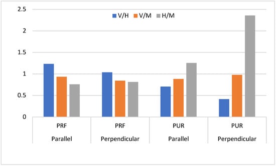 Figure 9 depicts the shear strength ratios of each arrangement in order to examine the effects of strips arrangements in greater detail. The shear strength ratios of V/H, V/M and H/M ranged from 0.41 to 2.36. Shear ratios revealed that strip arrangements had less effect on PRF-bonded laminated bamboo boards, with values ranging from 0.76 to 1.23, all distributed around 1.0. Meanwhile, the arrangement had a significant impact on PUR-bonded laminated bamboo boards, with strength ratios ranging from 0.41 to 2.36. Surprisingly, strip arrangements have very different effects on PRF- and PUR-bonded laminated bamboo boards. The mixed arrangement has the highest shear resistance capacity for PRF-bonded laminated bamboo boards, followed by the vertical arrangement and the lowest being horizontal. The strip arrangement had little effect on the lay-up pattern for PRF-bonded laminated bamboo boards, as both parallelly and perpendicularly assembled boards showed a fairly consistent shear strength ratio. The high variation in the shear strength ratio in PUR-bonded boards, on the other hand, revealed that the effect of strip arrangement on the board’s shear strength is significant. The horizontal arrangement of PUR-bonded laminated bamboo demonstrated the highest shear resistance capacity, followed by mixed and then vertical. In comparison to parallel boards, perpendicularly assembled laminated boards were heavily influenced by strip arrangement, as shown by their extremely wide range of shear strength ratio. Xing et al. [] speculated that the low compatibility of PUR adhesive with bamboo materials and the inferior strength of the resin itself may have contributed to the abnormal trend in PUR-bonded laminated bamboo boards.