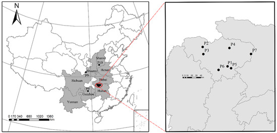 The geographic locations of collection sites were determined using GPS, consisting of latitude, longitude and altitude. Annual mean temperature, annual mean rainfall and relative humidity of each population were obtained from the National Meteorological Data of China (http://data.cma.cn/; 1981–2010, accessed on 20 February 2021). All climate factor information is shown in Table 1.