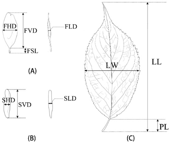 (A) Visual representation of sampled fruit and measured morphometric traits: FVD—Fruit vertical diameter; FHD—Fruit horizontal diameter; FLD—Fruit lateral diameter. (B) Visual representation of sampled seed and measured morphometric traits: SVD—Seed vertical diameter; SHD—Seed horizontal diameter; SLD—Seed lateral diameter. (C) Visual representation of sampled leaf and measured morphometric traits: LL—Leaf length; LW—Leaf width; PL—Petiole length.