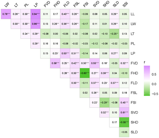 Correlation analysis among 15 phenotypic traits at the tree-level. Purple and green color represent positive and negative correlation, respectively. The darker the color, the stronger the correlation (* p < 0.05; ** p < 0.01; *** p < 0.001). Phenotypic trait abbreviations are shown in Table 2.