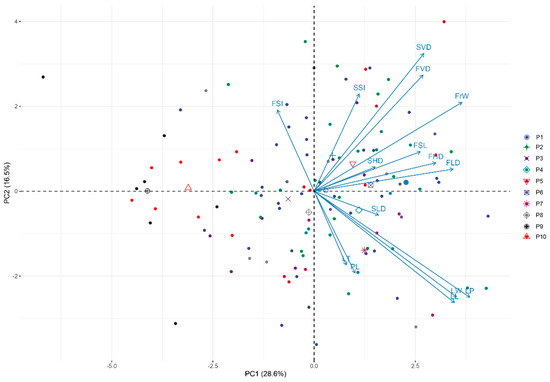 Biplot of the principal component (PC) analysis based on tree means of 15 morphometric traits in 10 studied E. ulmoides populations. The PC means of the populations are shown in the figure. Acronyms of populations: P1—Cljy; P2—Clylp; P3—Clgfq; P4—Cljylc; P5—Cldx; P6—Ydtms; P7—Tyrs; P8—Hcgq; P9—Lyjjh; P10—Wxgjz.