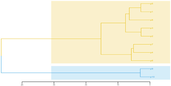 The P9 and P10 are located in the north of China and were in colder and drier conditions. As shown in Figure 4, the PC means of P9 and P10 were highly negative in PC1. It means that their leaves, fruits and seeds are significantly smaller than other populations. Based on the standardized population means for the 15 morphological traits, the 10 populations could be divided into two clusters using UPGMA method (Figure 5). The first cluster consisted of P1 to P8, and the second cluster included P9 and P10. Cluster analysis has a tendency to group according to geographical distance, indicating that geographical segregation exists in E. ulmoides.