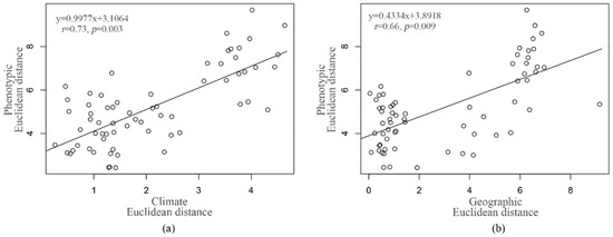 The relationships of the pairwise geographic (a) and climatic distances (b) with the phenotypic differences among populations.