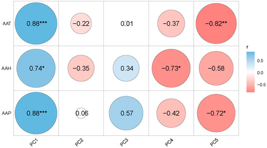 Correlation analysis among climate and PCs. Blue and maroon color represent positive and negative correlation. The darker the color, the stronger the correlation (* p < 0.05; ** p < 0.01; *** p < 0.001).