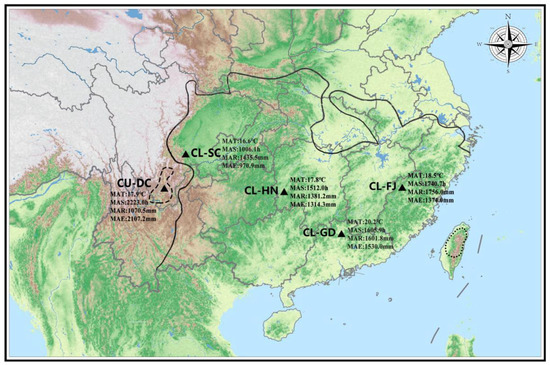 The distribution area of Cunninghamia and sources of experimental materials with local climate data. Solid line represents the distribution area of C. lanceolata, dash line represents the distribution area of C. unica, dot line represents the distribution area of C. konishii. MAT: mean annual temperature; MAS: mean annual sunshine duration; MAR: mean annual rainfall; MAE: mean annual evaporation.