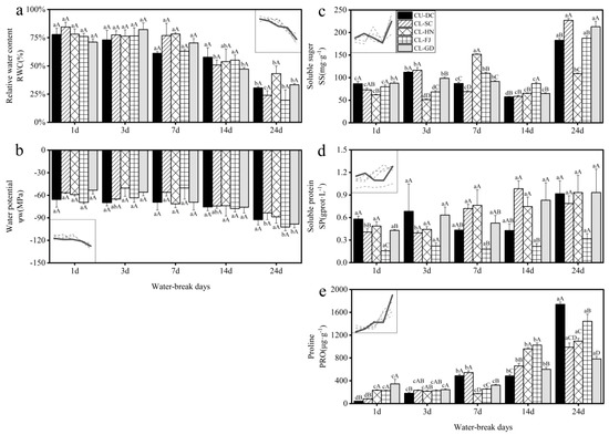 (a) relative water content (RWC), (b) water potential (Ψw), (c) soluble sugar (SS), (d) soluble protein (SP) and (e) proline (PRO) of C. unica and C. lanceolata leaves under different water−break days. Solid line and dash lines in the small line chart within each subfigure represent C. unica and C. lanceolata, respectively; different lowercase letters indicate significant differences between different treatments for seedlings from the same provenance (p < 0.05), and different uppercase letters indicate significant differences between different treatments for seedlings from different provenances (p < 0.05); the same as below.