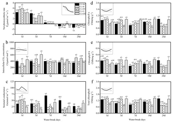 (a) net photosynthetic rate (PN), (b) intercellular CO2 concentration (Ci), (c) stomatal conductance (Gs), (d) chlorophyll a (Chla), (e) chlorophyll b (Chlb) and (f) total chlorophyll (Chl) of C. unica and C. lanceolata leaves under different water−break days.