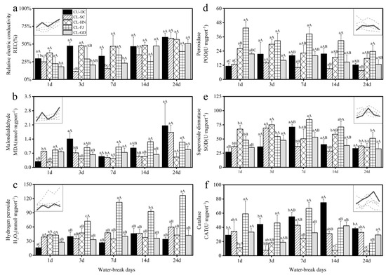(a) relative electric conductivity (REC), (b) malondialdehyde (MDA), (c) hydrogen peroxide (H2O2), (d) peroxidase (POD), (e) superoxide dismutase (SOD) and (f) catalase (CAT) of C. unica and C. lanceolata leaves under different water−break days.