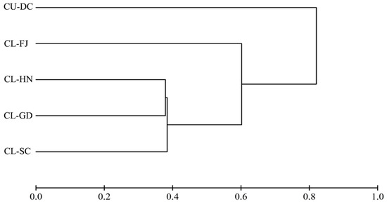 The drought tolerance of C. unica and four C. lanceolata seedlings could be categorized by cluster analysis of the D values. It was found that C. unica (CU-DC) was the most drought-tolerant type compared with C. lanceolata, and the four C. lanceolata seedlings, including Hunan Huitong (CL-HN), Guangdong Shaoguan (CL-GD) and Sichuan Hongya (CL-SC), were the most non-drought-tolerant type, while Fujian Shunchang (CL-FJ) ranked in the intermediate position (Figure 5).