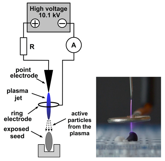 The seeds were exposed to NTP produced by the DC electric discharge generated by a point-to-ring electrode system. This electric discharge was based on the cometary discharge described by [43]. The scheme of the apparatus used is depicted in Figure 1. The working point electrode was made of a medical stainless-steel needle Medoject (0.6 × 25 mm), connected through a resistor R = 3 MΩ to the positive terminal of the high-voltage DC power supply. The ring electrode, realized by a 1 mm diameter nickel wire forming a 10 mm diameter circle, was connected through an ammeter to the negative terminal of the DC high-voltage power supply. The distance between the working electrode and the ring electrode was 3 mm. The discharge voltage was set to 9.65 kV, the discharge current to 150 µA, and the source voltage to 10.1 kV.