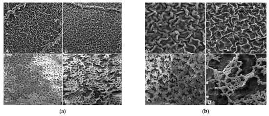 Scanning electron microscopy of the black-locust seed surface after NTP treatment with these expositions: A, 0 min; B, 5 min; C, 10 min; and D, 20 min. Figure (a) magnification 2000×; Figure (b) magnification 5000×.