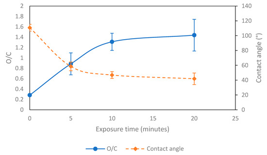 The contact angle describes the hydrophilicity or hydrophobicity of the surface, which is related to the ability of the seeds to germinate. Figure 3 shows that the contact angle decreased with increasing exposure time from (111 ± 5) ° to (42 ± 8) °. An exposure time of 10 min was the turning point of this treatment, and the increase in the O/C ratio was slow.