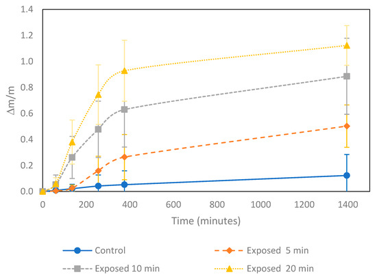 The effect of NTP treatment duration on the water uptake of the seeds is shown in Figure 4. The water uptake increased with increasing treatment duration. The highest imbibition values were recorded for seeds treated with NTP for 20 min. A breakpoint of 400 min (x-axis) was evident for all treatment times used.