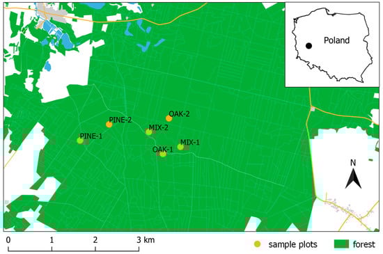 We selected six sample points in stands of similar spatial structure: two in coniferous (Pinus sylvestris), two in mixed (Pinus sylvestris and Quercus petraea) and two in deciduous (Quercus petraea) stands (Table 1, Figure 2). The process of choosing sample stands was carried out in two stages. First, stands meeting certain criteria (min. area of 2 hectares, only 1 tree layer, located min. 500 m from the forest edge and average DBH of 75–85 cm) were selected in the forest database of the study area (N: 51°53′40″–51°53′00″, E: 16°16′40″–16°19′10″). Then, 2 stands for each forest type were randomly selected (using a random number generator to choose the stand ID). Each sampling plot retained structural homogeneity in terms of management and understory cover. The stands were composed of only two layers: the canopy layer and the understory.