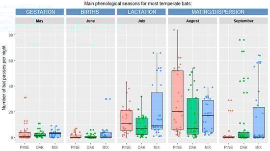 Bat foraging activity in coniferous (PINE), mixed (MIX), and deciduous (OAK) forests for main phenological seasons characteristic for most temperate bats (from May to September).