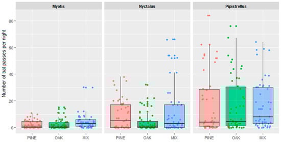 We also performed a comparison of bat activity in different forest types separately for the most abundant bat genera, Pipistrellus, Nyctalus, and Myotis. The results were inconclusive, with preliminary analysis of variance on ranks showing no effect and GLMM indicating a significant effect of forest type on the foraging activity of tested bat groups. This may mean that despite the lack of effect of forest type on all bats analyzed together, forest type or even specific tree species may be important for some bat species or groups.
