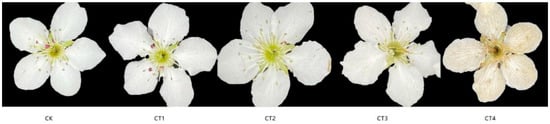 Browning is the most obvious form of flower damage caused by low-temperature stress [16]. To observe the condition of the five pear flower organs after freezing, we selected one representative ‘Jinguang’ pear flower from each treatment sample to photograph and record the degree of browning (Figure 1). In the ‘Jinguang’ pear flower, we observed no damage in samples from the CK (18 °C), CT1 (2 °C), CT2 (0 °C), and CT3 (−2 °C)groups at temperatures above CT4 (−4 °C), but the damage was evident in samples held at or below −4 °C. The average supercooling or critical freezing point of ‘Jinguang’ pear flower organs was −5.7 °C. This temperature represents the lower limit of the temperature range for biochemistry adaptation in this variety.