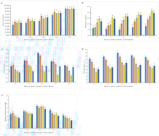 The effects of low-temperature stress on the relative conductivity of flower organs, malondialdehyde (MDA), superoxide dismutase (SOD), catalase (CAT), and soluble protein (SP) contents of different varieties. Variation in the (a) relative conductivity. (b) MDA, (c) SOD, (d) Soluble protein, and (e) CAT contents under low-temperature stress. Error bars indicate the standard error, and different lowercase letters indicate significant differences between treatments (p < 0.05).