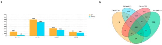 Flowers of the ‘Jinguang’ pear variety showed large numbers of DEGs under various levels of cold stress. As the treatment temperature decreased, the number of DEGs first increased and then decreased. Compared with CK, a total of 1067 DEGs were identified in the CT1 treatment, including 890 up- and 177 downregulated genes (Figure 3a). The CT2 treatment group had the highest number of DEGs (6378), including 3483 up- and 2895 downregulated genes. Plants may activate more genes to participate in the freezing response at or below 0 °C, thereby improving frost resistance. There were 2872 DEGs in the CT3 treatment group, including 1608 up- and 1264 downregulated genes, and 1529 DEGs in the CT4 treatment group, including 844 up- and 685 downregulated genes. Among these four groups, more DEGs were upregulated than downregulated, indicating that ‘Jinguang’ pear flowers subjected to cold stress resist freezing damage through gene activation. The CT1, CT2, CT3, and CT4 treatment groups had 412, 3698, 257, and 139 unique genes, respectively (Figure 3b). The total number of DEGs in the four comparison groups CK and CT1, CK and CT2, CK and CT3, and CK and CT4 was 259.
