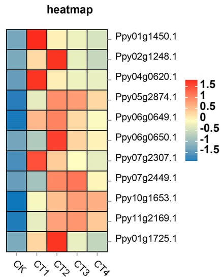 Due to the frequent occurrence of extreme weather, ‘Jinguang’ pear trees are often threatened by low temperatures. Low-temperature stress induces the expression of LHY, which activates the transcription of VIN3 through different cis-elements, which is of great significance to plant growth and development. BBX19 is a member of the B-box family, which induces the expression of rice OsBBX19 under low-temperature stress and participates in abscisic acid and methyl jasmonate signal transduction [43]. PSK recognizes the phytosulfokine receptor (PSKR) on the cell membrane for signal transduction, and PSKR plays a key role in signaling pathways related to plant responses to environmental stimuli [44]. In this study, the BBX19, LHY, and PSK genes had high connectivity in the cyan module co-expression network, and their upregulated expression was highest in the CT4 treatment, indicating their potential roles in low-temperature responses.
