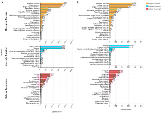 GO results for DEGs between CK and the (a) CT1 and CT2 (>0 °C) and (b) CT3 and CT4 (<0 °C) treatment groups.