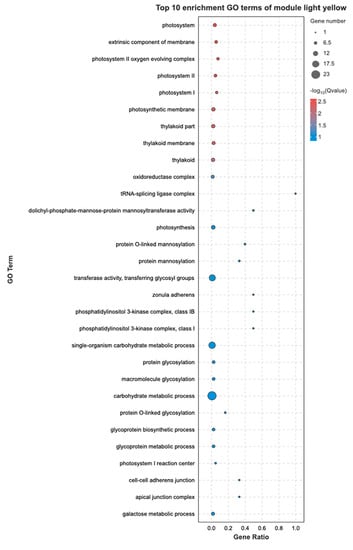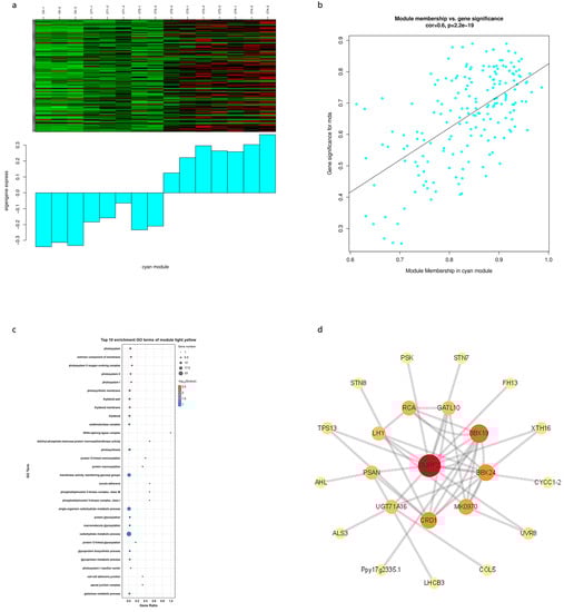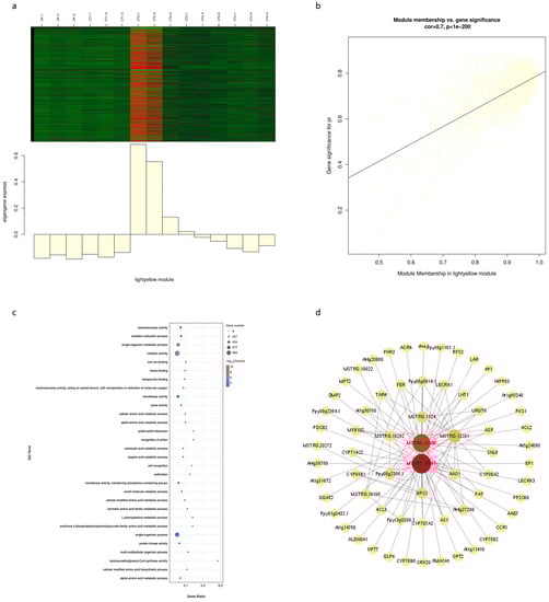 (a) Gene co-expression heat map of the light yellow module (upper panel) and expression of corresponding signature genes in each sample (lower panel). (b) A hub gene point map showed high connectivity and expressivity for MDA content and the light yellow module. The x-axis represents the correlation between the expression of each gene and the module, and the y-axis represents the correlation between each gene and the trait. (c) GO enrichment analysis of hub genes associated with MDA content in the light yellow module. (d) Co-expression network of hub genes in the light yellow module. The network was constructed using the top 100 hub genes, with a weight > 0.30.
