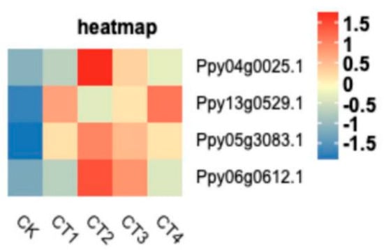 Studies have found that low-temperature stress leads to a decrease in enzyme activity and hinders the synthesis of various regulatory substances. Low-temperature stress is closely related to changes in the content of flavonoids, polyphenols, anthocyanins, and other substances in walnut leaves [29]. In this study, four upregulated DEGs (Ppy04g0025.1, Ppg13g0529.1, Ppy05g3083.1, and Ppy06g0612.1) were significantly enriched in flavonoid biosynthesis pathways: chalcone synthase, shikimate hydroxycinnamoyl transferase, anthocyanin synthase, and anthocyanin reductase, respectively (Figure 8). Chalcone synthase is the first rate-limiting enzyme in the flavonoid synthesis pathway, and is responsible for catalyzing the combination of three molecules of malonyl-CoA and one molecule of coumaroyl-CoA to form chalcone [30], which further produces various flavonoids [31]). Hydroxycinnamic acyltransferase belongs to an important branch of the plant acyltransferase family and is a key enzyme in the lignin synthesis pathway [32]. Phenolic compounds such as lignin and flavonoids can improve plant resistance [33]. Anthocyanins have diverse functions, and play important roles in plant resistance to low-temperature stress [34]. Anthocyanin synthetase is a key enzyme in anthocyanin biosynthesis [35], and anthocyanin reductase is a key procyanidin monomer biosynthesis enzyme that plays an important regulatory role in anthocyanin accumulation in plant tissues [36]). The expression levels of four genes in this pathway were significantly upregulated under cold stress, which may directly affect biochemistry processes such as cell growth, metabolism, and enzyme activity in response to low-temperature stress.