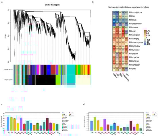 Weighted gene co-expression network analysis (WGCNA) and module–trait correlation analysis results. (a) Hierarchical clustering tree showing co-expression modules identified using the dynamic tree-cutting method. Different modules are indicated by different colors. Each leaf in the tree represents a gene. The main branches formed 16 modules, indicated by different colors. (b) biochemistry indicators and WGCNA modules. Each row corresponds to a module shown in (a). The columns correspond to biochemistry indices, and the color of each cell indicates the difference between the correlation coefficient module and the biochemistry index. Numbers in the cells indicate correlation coefficients; asterisks indicate statistical significance. (c) Correlations between soluble proteins and WGCNA modules. (d) Correlation between MDA content and WGCNA modules.