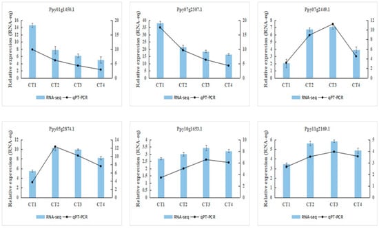 In order to verify the accuracy and reliability of RNA-seq data, six genes related to the response to low-temperature stress were selected for qRT-PCR validation in this study. The results are shown in Figure 12. The results are basically consistent with the sequencing data, indicating that the sequencing results are highly reliable.