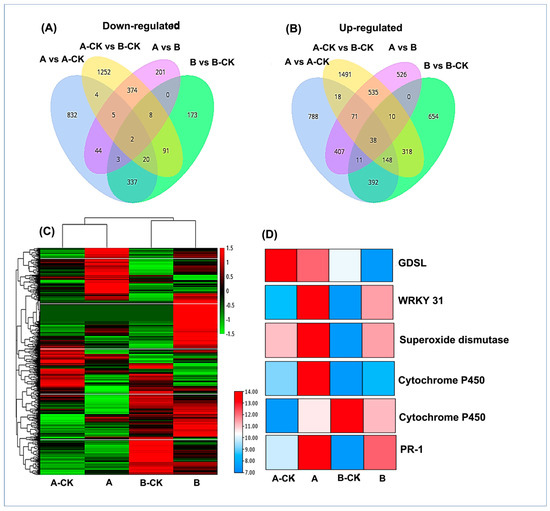The expression levels of all DEGs were presented in a heat map. The color differences indicate higher expression (red color) and low expression (green color). To visualize the common and unique DEGs in each comparison groups, a Venn diagram was generated which showed that only 38 and 2 up and down regulated common DEGs exist, respectively. Whereas 788, 654, 1491, 526, up- and 832, 173, 1252, and 201 down regulated DEGs were uniquely expressed in A vs. A-CK, B vs. B-CK, A-CK vs. B-CK and A vs. B respectively (Figure 2A–C).
