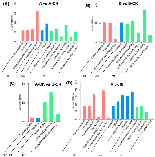 Gene Ontology (GO) classifications of differentially expressed genes. The differentially expressed genes were grouped into three hierarchically stretched GO terms, biological process (BP), cellular component (CC), and molecular functions (MF). (A) Comparison between A and A-CK, (B) Comparison between B and B-CK, (C) Comparison between A-CK and B-CK, (D) Comparison between A and B. Treatments: A-CK (Dawei-un-inoculated control), A (Dawei- inoculated with B. cinerea), B-CK (Qiuxiang-un-inoculated control), B (Qiuxiang- inoculated with B. cinerea).