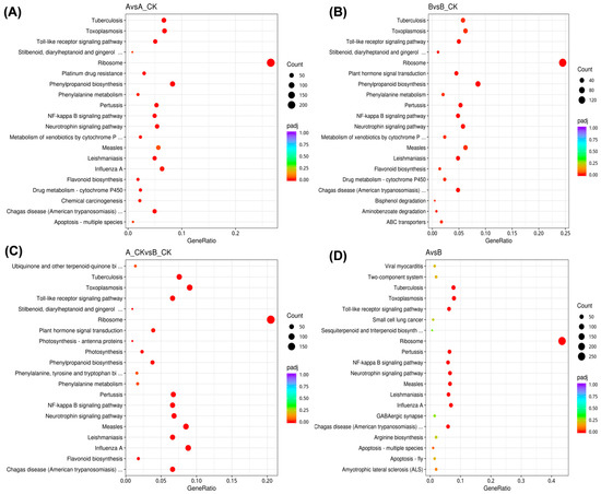 Kyoto Encyclopedia of Genes and Genomes (KEGG) pathway enrichment scatter plot. (A) Comparison between A and A-CK, (B) Comparison between B and B-CK, (C) Comparison between A-CK and B-CK, (D) Comparison between A and B. The vertical axis represents the path name, and the horizontal axis represents the path factor corresponding to the Rich factor. The size of the q-value is represented by the color of the point. The smaller the q-value, the closer the color is to the red color. The number of differential genes included in each pathway are expressed by the size of the point. Treatments: A-CK (Dawei-un-inoculated control), A (Dawei- inoculated with B. cinerea), B-CK (Qiuxiang-un-inoculated control), B (Qiuxiang- inoculated with B. cinerea).
