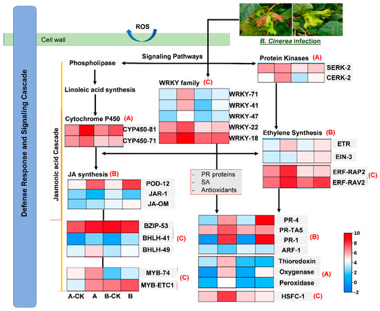 JA is considered the most important phytohormone in defense mechanism and is responsible for induction of antioxidant enzyme, POD [26]. One POD-12 gene (Cluster-35363.20218) was identified involved in JA synthesis cascade which showed higher expression after B. cinerea infection in both varieties. Similarly, one JA amino synthetase gene JAR-1 (Cluster-35363.13467) showed increased expression after B. cinerea infection, but the highest expression was again recorded in resistant Dawei. In addition, another JA-related gene, Jasmonate O-methyltransferase J-Om (Cluster-35363.4911) was found with an increased expression after infection in both varieties (Figure 5B).